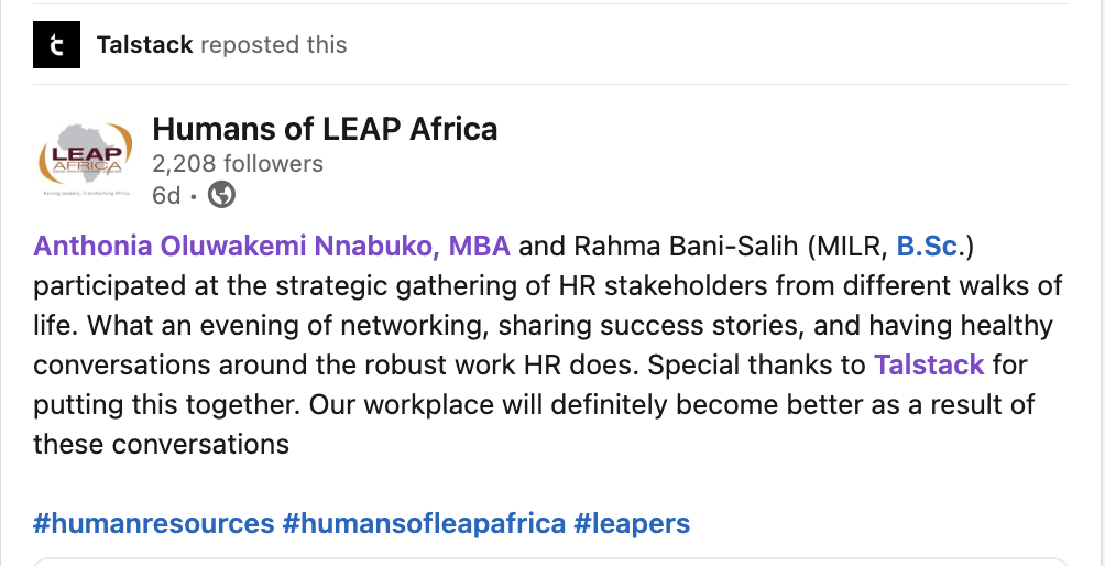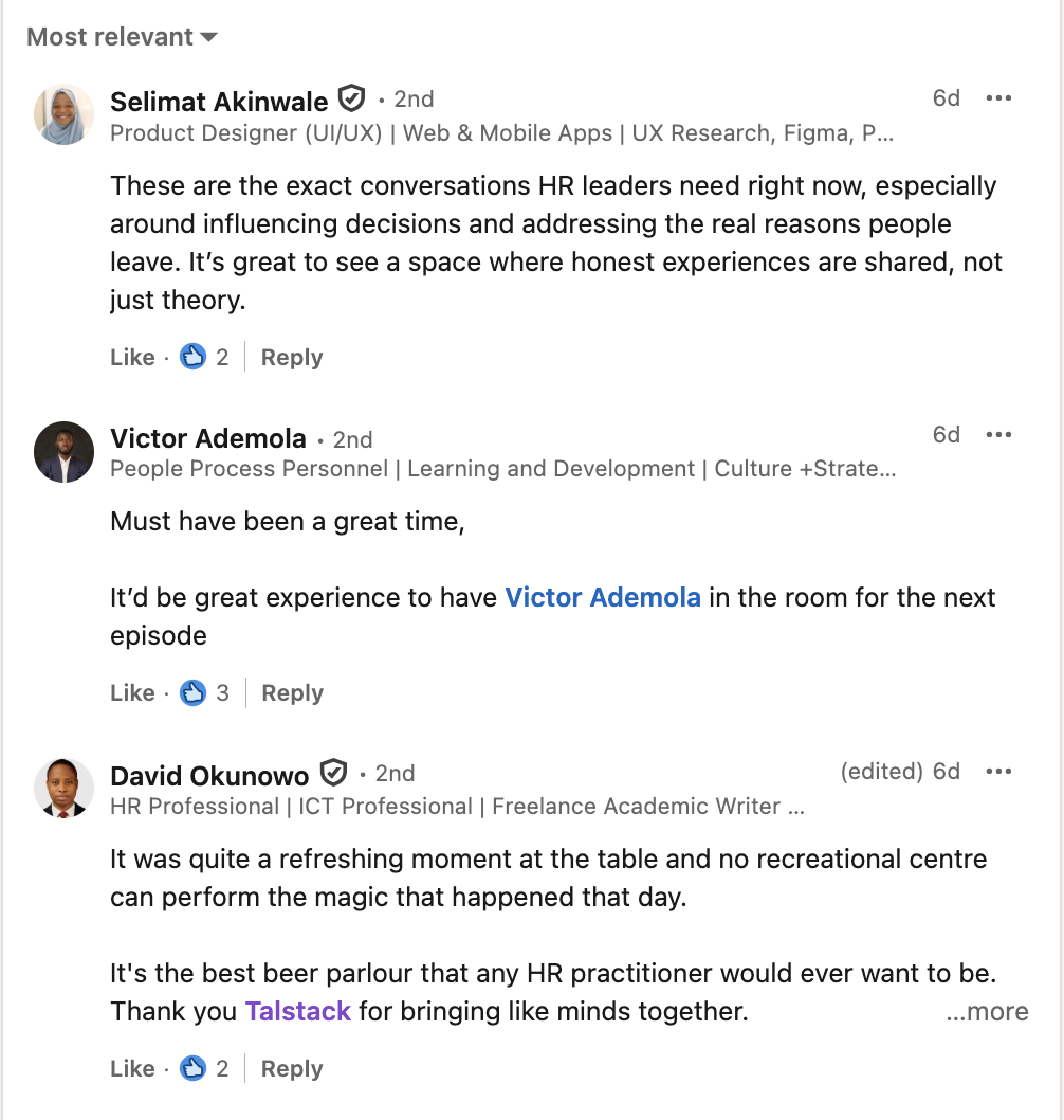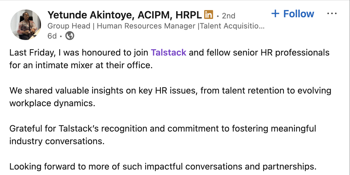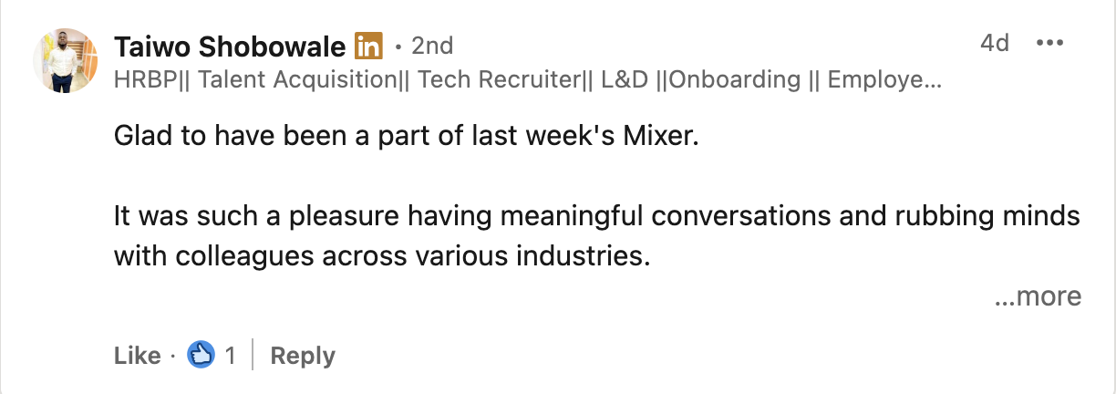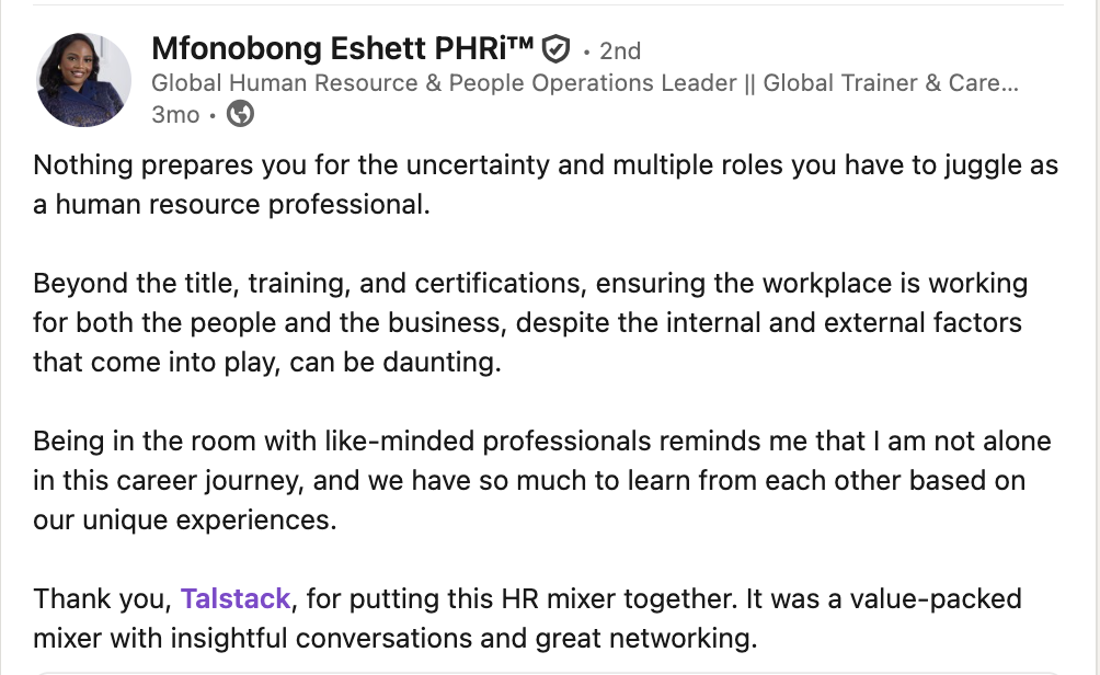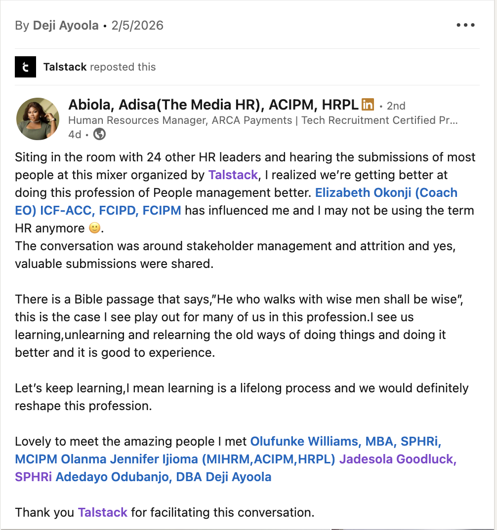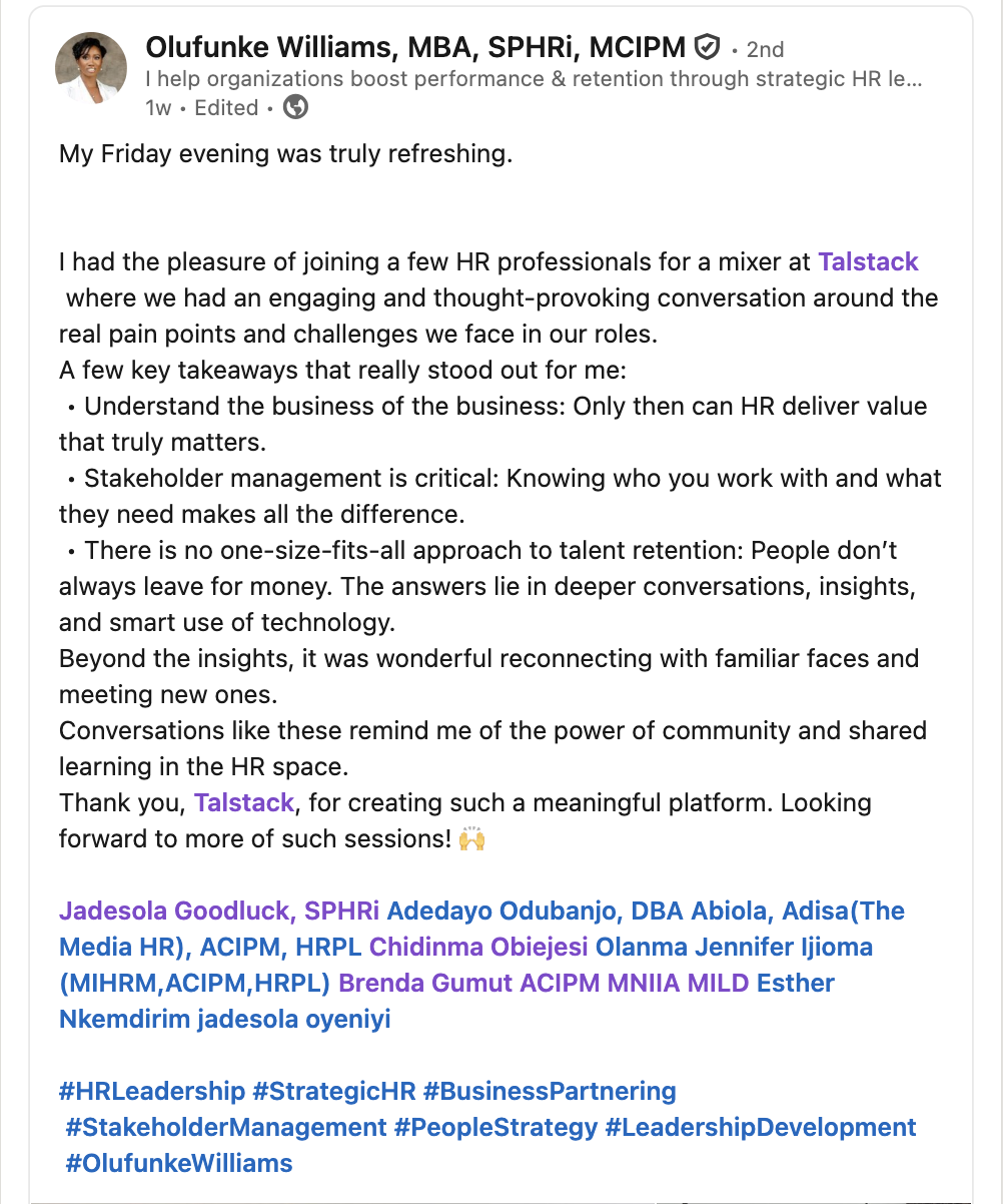 Discover Talstack Mixers, monthly no-slides meetups where HR leaders in Nigeria share real challenges, practical solutions, and build meaningful connections over food and drinks.