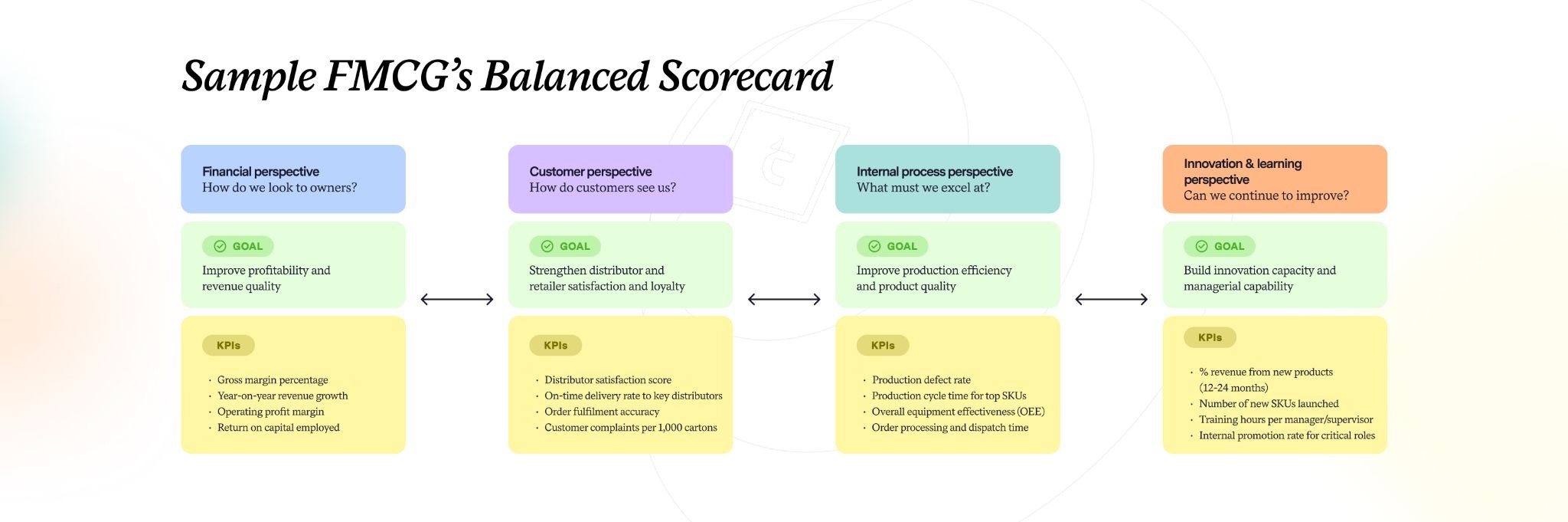 Imagine a mid-sized FMCG business based in Ghana, supplying detergents and household cleaners across West Africa. Their Balanced Scorecard might look something like this: