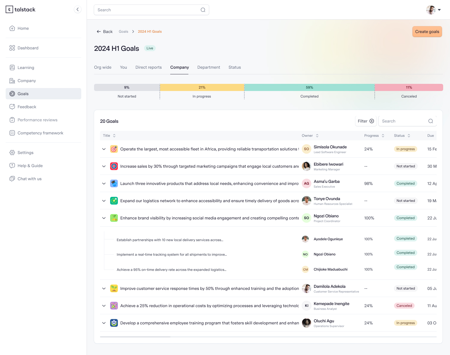 Talstack's “Goals” is a lightweight, extremely intuitive tool for leaders, managers and employees to set clear priorities, align teams, and track progress in real time.